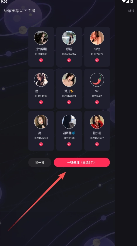 登录后,系统会依据大数据分析出的用户习惯,智能推送一批主播,你可以选择关注其中部分主播,也可以选择关注全部主播。