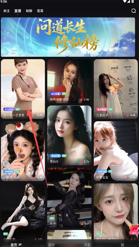 关注后进入首页,挑选你感兴趣的主播类型,点击即可免费观看。