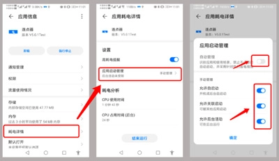 应用管理→自动化助手→耗电详情→应用启动管理→关闭自动管理→开启“允许自启动、允许关联启动、允许后台启动”三项设置