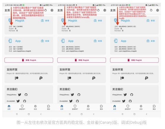 有些刚接触的用户记性不太好,在设置里把“隐藏Magisk应用”的选项打开后修改了面具的名称,转天就记不清自己用的面具是哪个版本了。这种情况其实挺常见的,所以单靠“图标是脸谱样式、应用名叫Magisk”来判断版本,会有一定的限制。接下来我就教大家怎么通过面具的主页界面来辨别版本。下面图一中展示的几个面具主页,从左到右分别对应稳定版、金丝雀(Canary)版和调试(Debug)版。