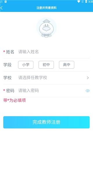 接下来点击注册按钮,填写姓名、学段、学校等各类基本信息,随后点击完成教师注册的操作。