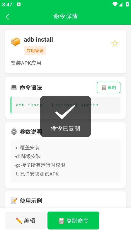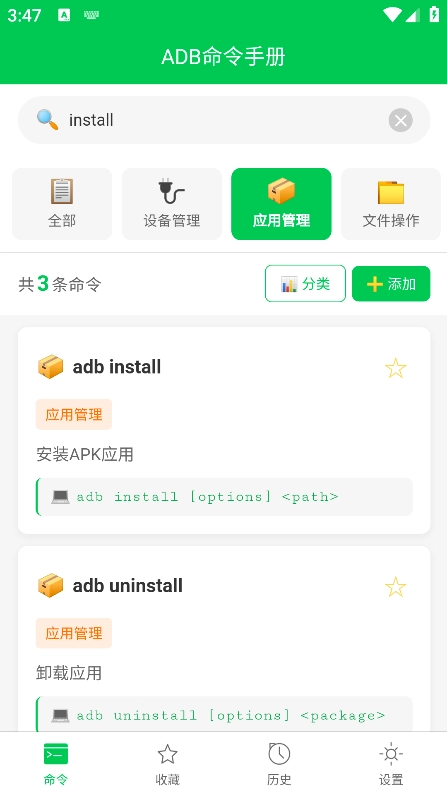 比如搜索“安装APK”相关命令,进入“应用管理”分类页面,定位到“adb install”条目后点击查看具体信息。