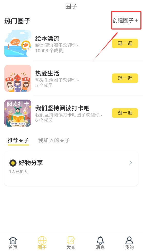 进入首页后,你可以先创建一个圈子,这样一来,许多关注这个圈子的人就能相互交流、彼此借鉴经验了。