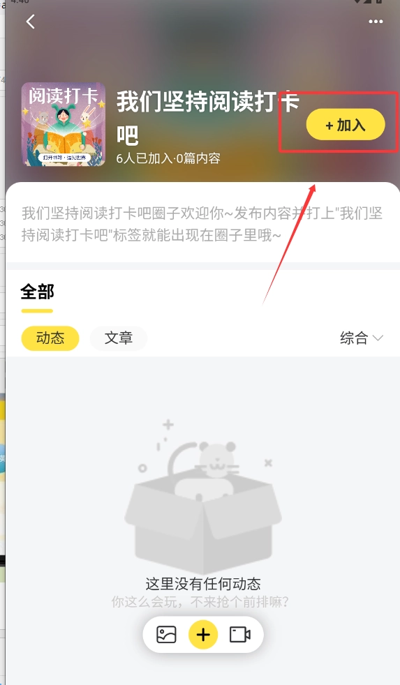 进入阅读打卡页面后,你可以选择加入其他用户创建的圈子,和大家一起分享、交流阅读心得,点击相应按钮就能完成加入操作。