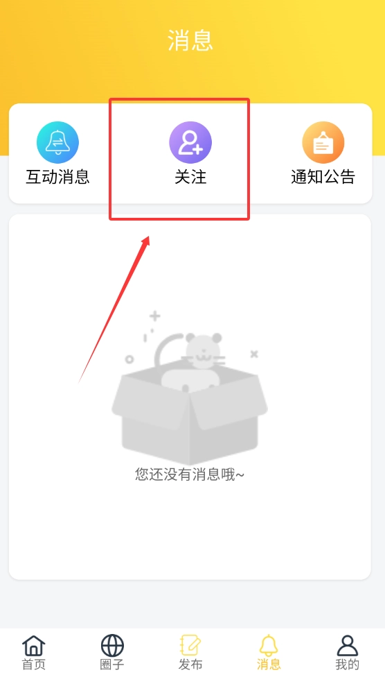 你可以在消息页面里,点击进入关注界面,查找之前添加的圈子相关消息。