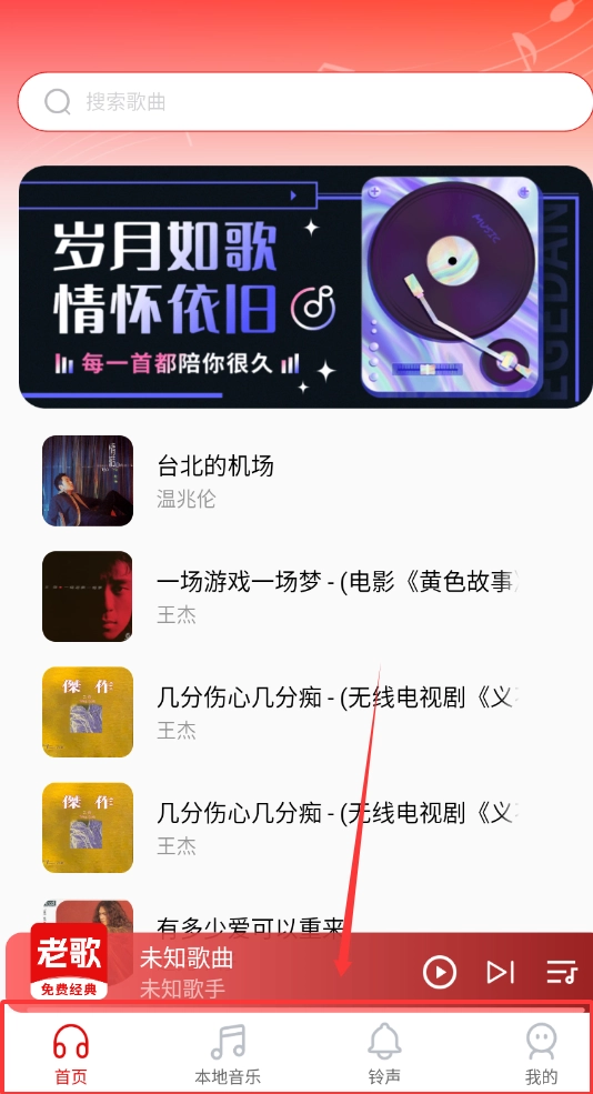 进入首页后,根据提供的选项挑选出你喜爱的歌曲,点击该歌曲就能进入播放页面啦。
