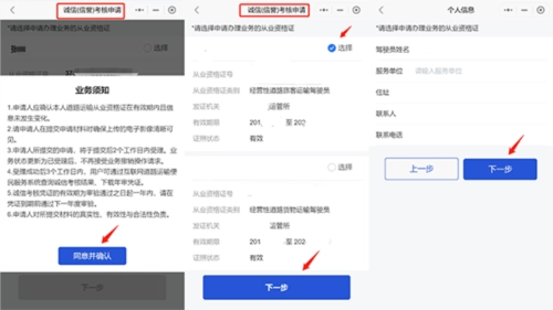 二、当前平台支持办理道路旅客运输、普通货物运输及危险货物运输驾驶员的诚信考核业务。用户在小程序完成注册登录与实名认证后,系统会通过本人身份证号自动关联已有的从业资格信息。仔细阅读诚信(信誉)考核业务须知后,点击【同意并确认】,即可进入从业资格证信息选择页面,需确认本人道路运输从业资格证处于有效期且信息无变动,选定需办理业务的证件后点击【下一步】完善个人信息。页面展示的个人信息由从业人员信息自动关联生成,除姓名外,其余信息均可编辑修改,其中“服务单位”需自行填写,有单位的填写单位名称,无单位的可填写“个人”。确认信息无误后,点击进入【下一步】。