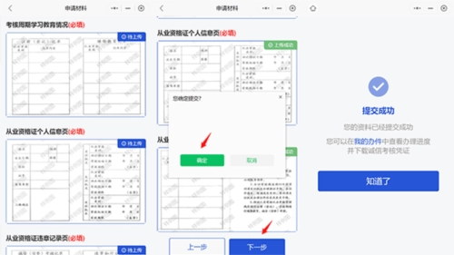 从业资格证违章记录页面。申请人需依据页面呈现的上传材料示例,上传格式为png或jpg、大小不超过10M的图片,且要保证上传的电子影像清晰可辨。成功上传的材料,其右上角会出现“上传成功”的提示文字。待所有材料上传完毕并确认无误后,点击【下一步】按钮即可提交。