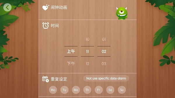 在这里你可以挑选日期,还能按照上下午的时间顺序,设置闹钟提醒的具体时间;而在页面上方的闹钟动画区域里,你可以选择不同的“怪物”形象,让它们来为你提供提醒铃声和故事内容。