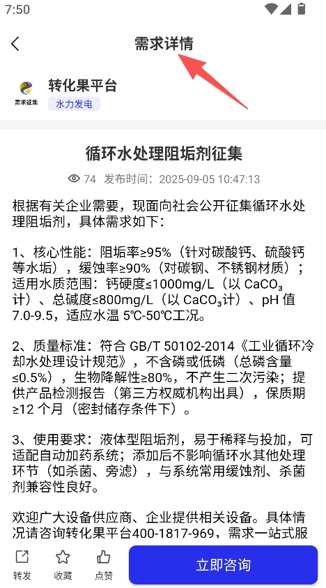 进入行业分类页面后,可查看具体的需求详情(例如循环水处理阻垢剂的征集信息)。