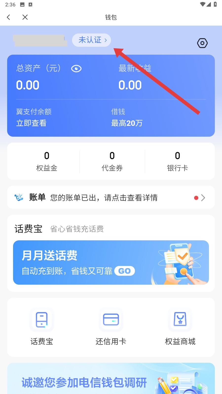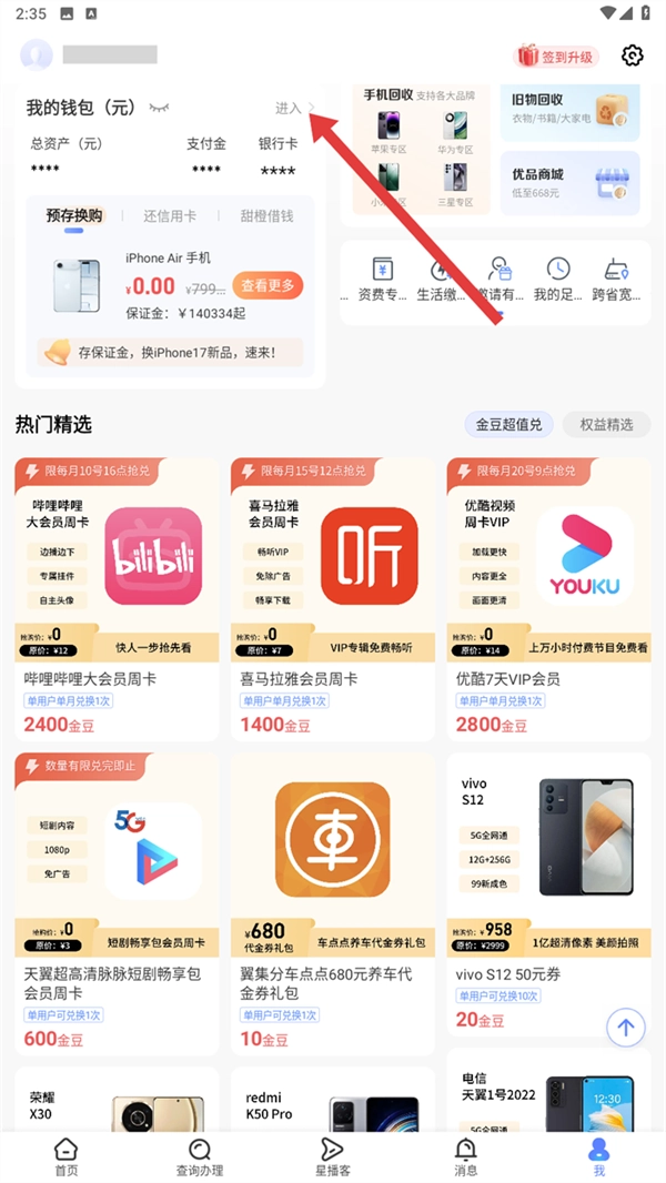 我们打开中国电信,点击【我】页面里的【我的钱包-进入】选项,进入钱包界面后就可以开启实名认证流程了。