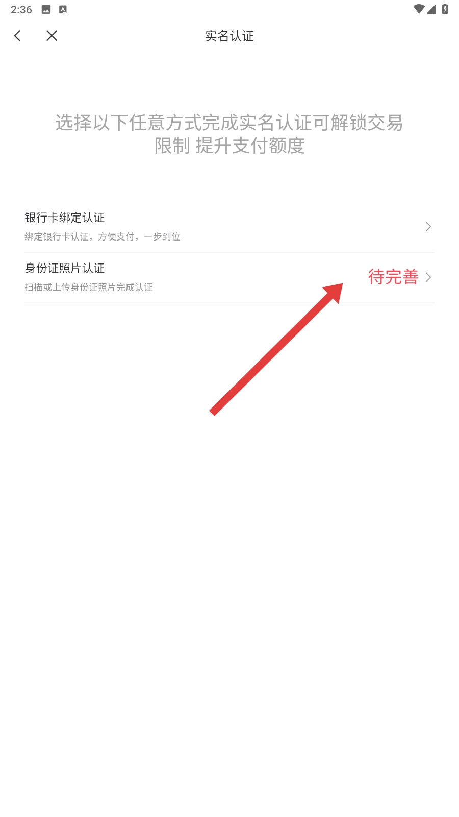 在实名认证页面,选择【身份证照片认证-待完善】选项,即可进入证件上传的环节。