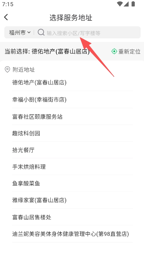 打开软件后,进入服务地址选择界面,通过搜索功能查找或直接挑选附近的地址,例如德佑地产富春山居店。