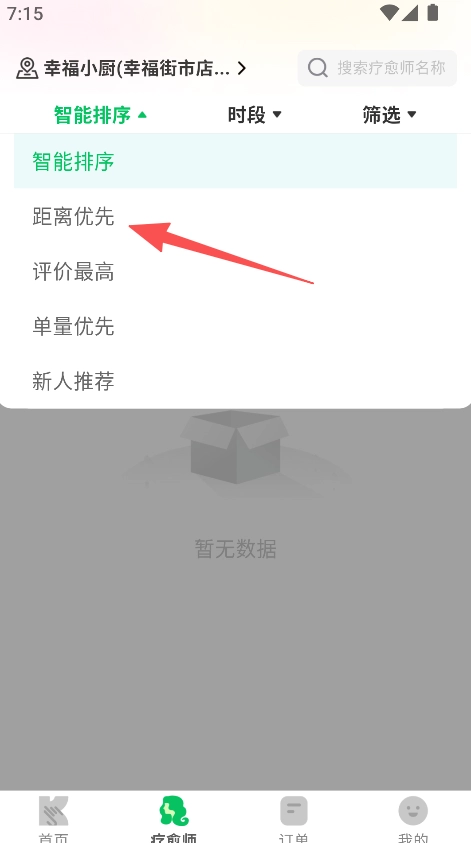 进入疗愈师界面,选择排序方式(如距离优先)。