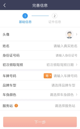 请填写姓名、身份证号码、初次领取驾驶证日期、车牌号码、品牌车型、车身颜色,并选择服务站后点击下一步。
