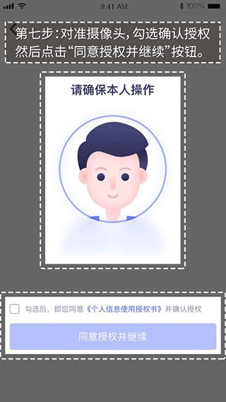 请将面部对准摄像头,勾选确认授权的选项后,点击“同意授权并继续”按钮以完成人脸识别流程。