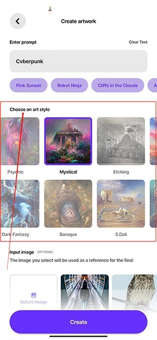 接着找到下方的「Choose an art style」选项,挑选你喜欢的风格,这里我建议选Fantasy Art,它的效果和赛博朋克风格比较贴近!