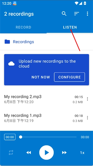 点击页面上的“LISTEN”按钮,即可查看录音列表,并能从中选择任意一条录音进行播放或管理操作。