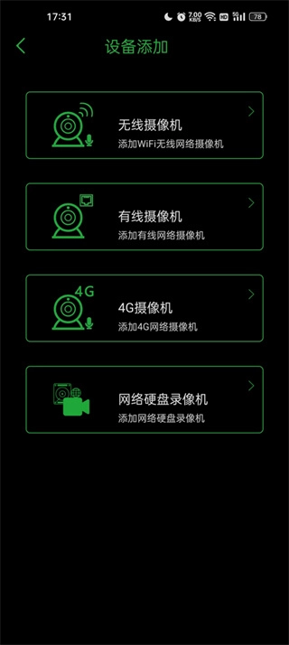 接下来选择你要添加的设备,依据摄像头的类型来添加,这里包含无线摄像机、有线摄像机、4G摄像机、网络硬盘录像机这四种类型的设备。