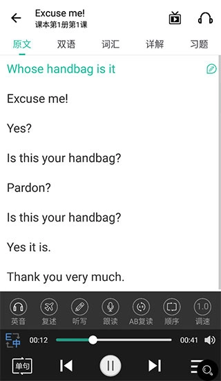 课程页面支持原文与双语两种模式的切换,底部还设有“复述”“听写”“调速”等快捷功能选项,方便你依据自身学习需求进行灵活调整。