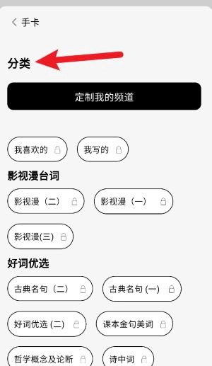 点击分类标签即可浏览不同主题类型的作文手卡内容,涵盖影视、哲学、古文等多种分类。