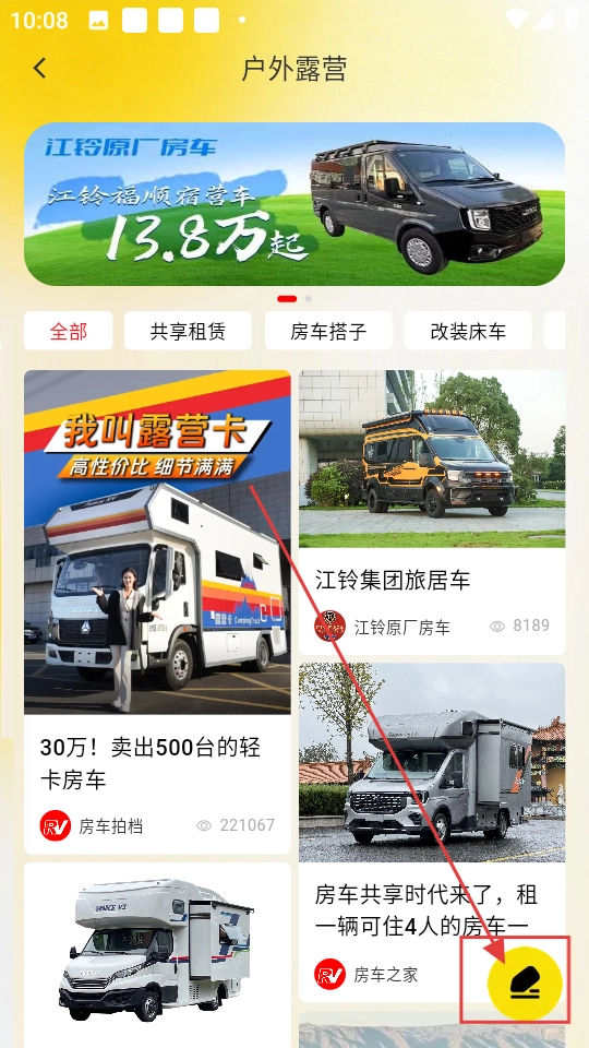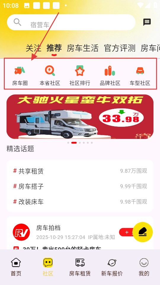 点击【房车圈】,进入户外露营板块,就能查看房车相关内容啦。