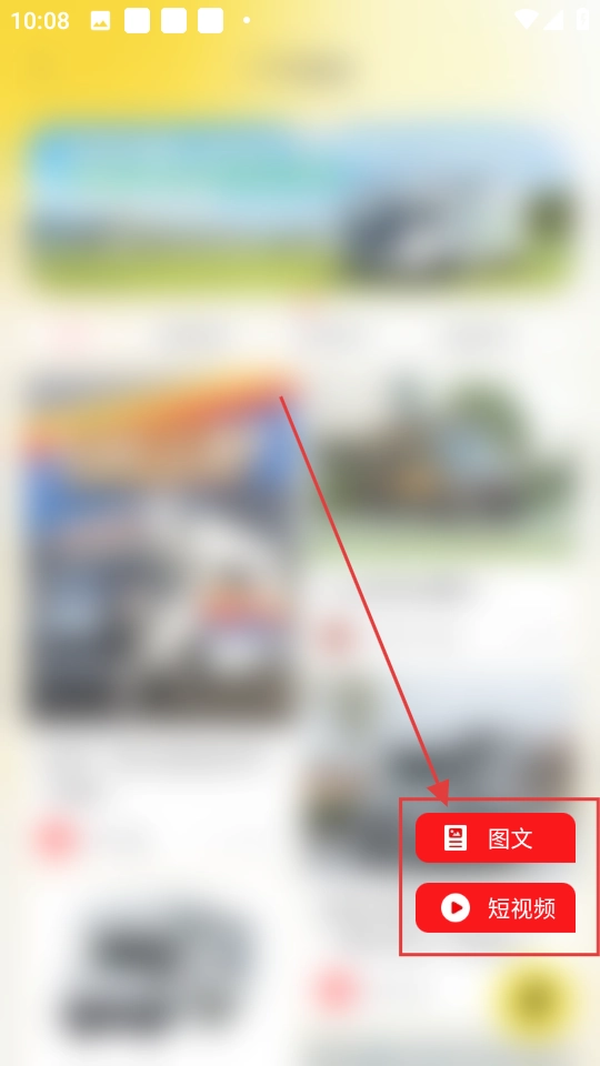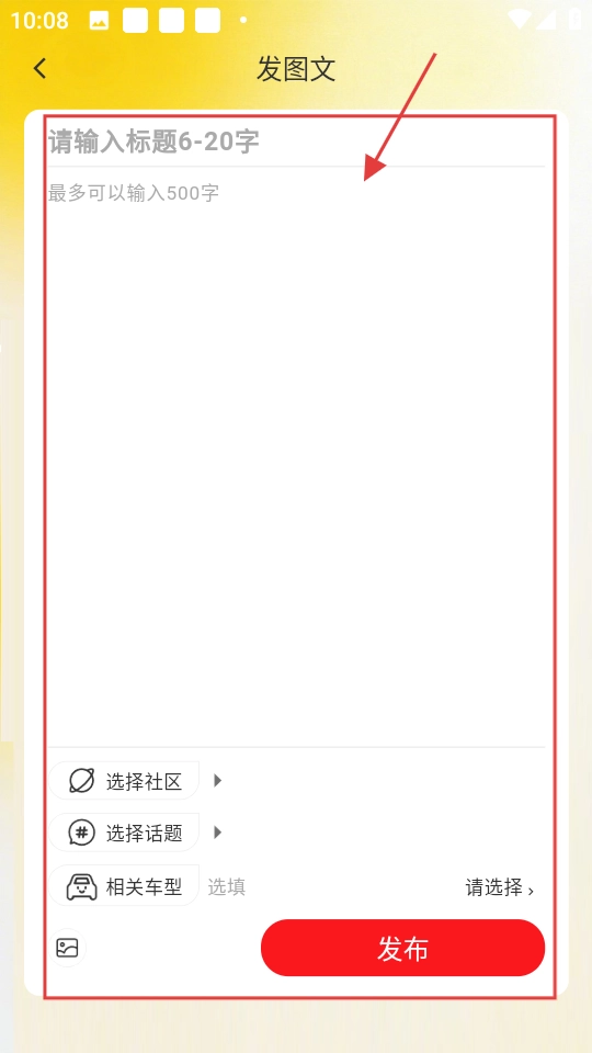 在图文发布界面填写标题与内容,选定社区、话题等选项后点击【发布】按钮,即可分享房车相关的内容了。