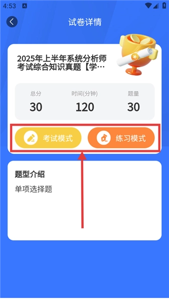 在试卷详情页面,你能够挑选考试模式或者练习模式来开展答题。