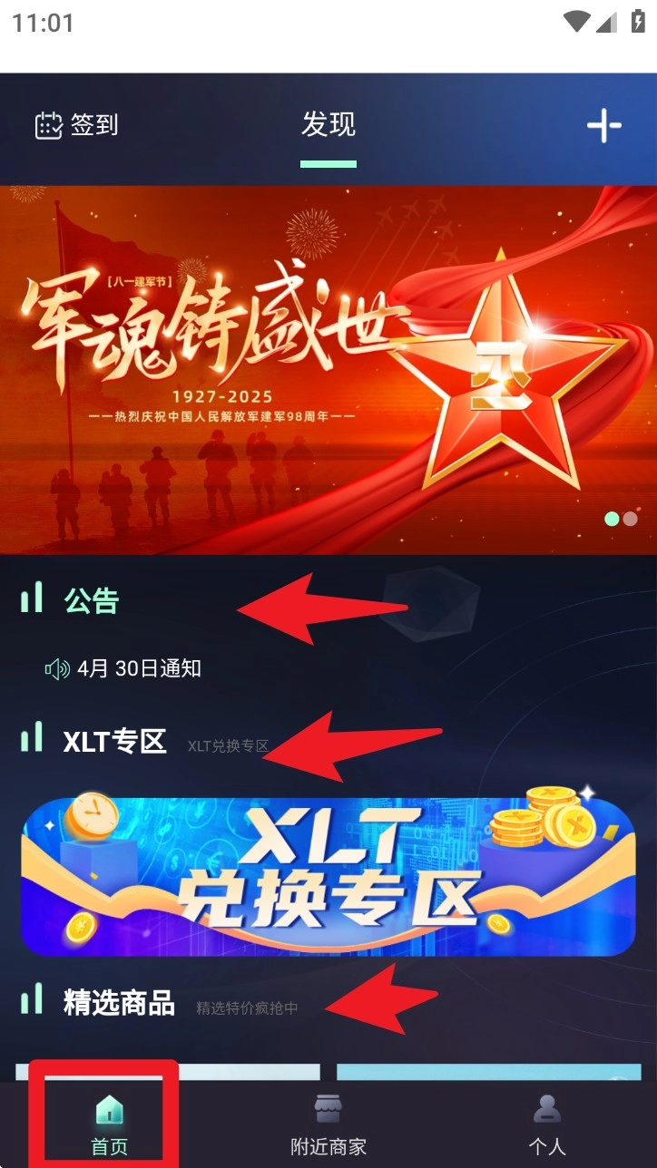 进入首页后,点击XLT专区进入兑换页面,就能查看当下热门的兑换商品以及最新发布的公告内容。