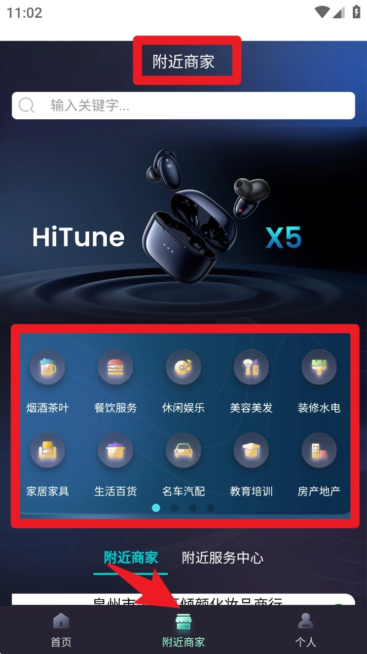 切换到附近商家页面,就能按照分类迅速找到本地生活服务,像餐饮、家居、教育这类门类都包含在内。