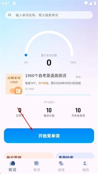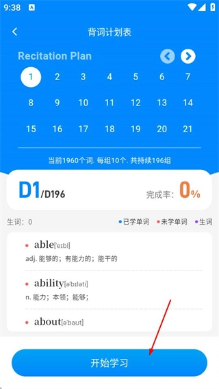 在背词页面点击“开始背单词”按钮,即可进入背词计划表页面。