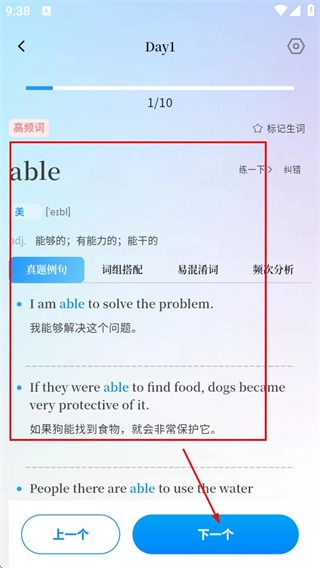 在完成当前单词的学习后,点击“下一个”按钮,就能接着学习下一个单词。