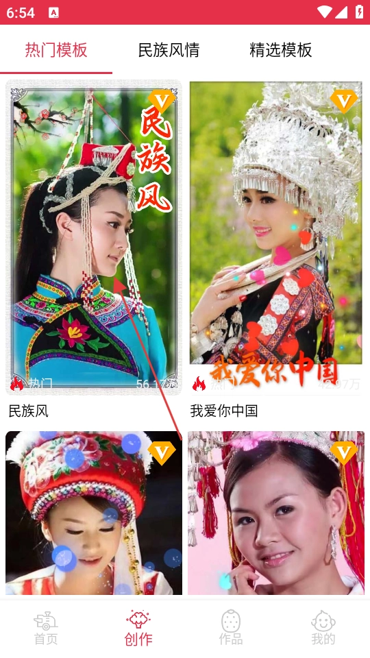 在创作页面的热门模板中,选择【民族风】模板。