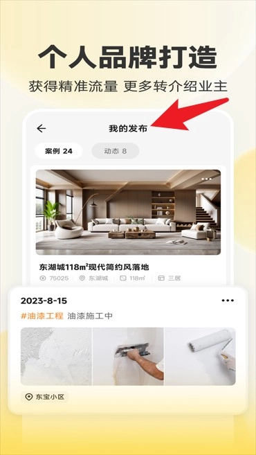 搭建个人品牌展示页面,上传施工案例和动态信息,精准触达目标业主,增加转介绍的可能性。
