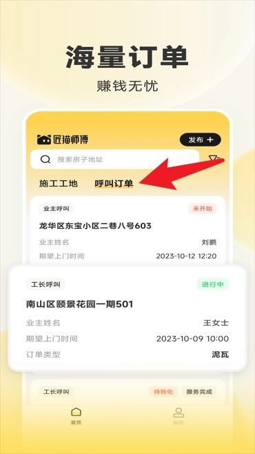 平台上有大量订单,接单赚钱很容易,还能随时查看施工进度和客户预约情况。