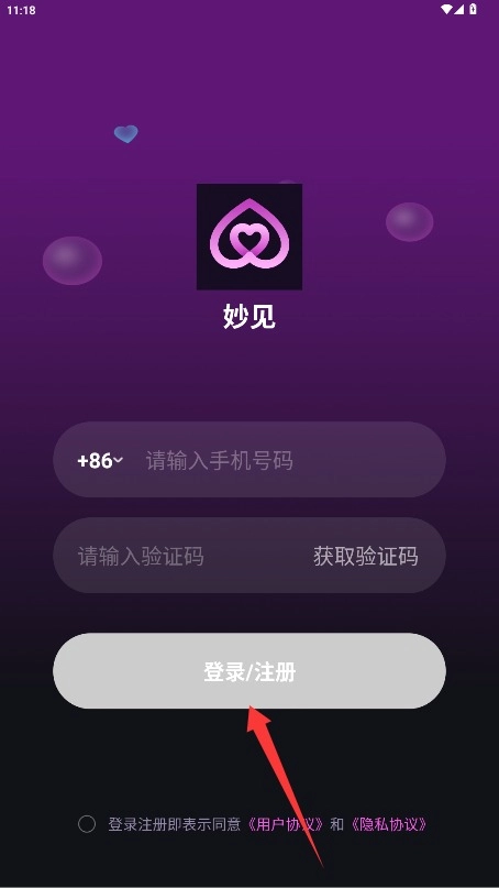在登录界面填写手机号与验证码,勾选同意相关协议条款后,点击登录/注册按钮即可进入应用。