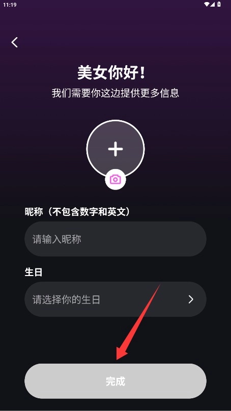 完善个人信息时,需上传头像照片文件,设置个性昵称与生日信息,之后确认提交相关资料。