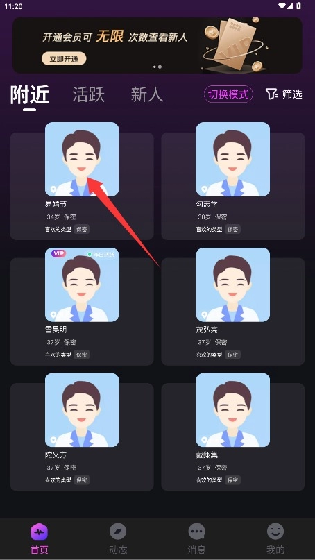 进入首页后启用定位服务功能,浏览周边用户列表,点击感兴趣的头像以查看其详细资料。