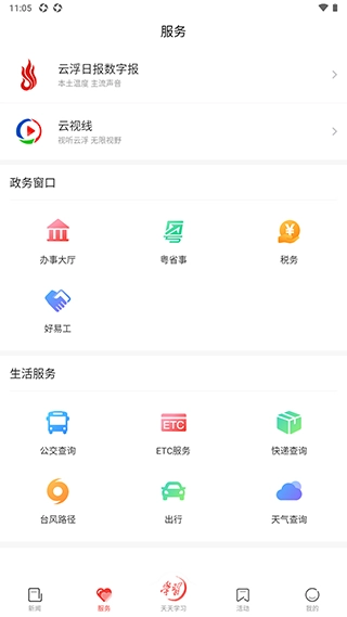 点击底部的“服务”栏,即可进入政务服务、生活服务等线上办理平台,畅享各类便民服务。