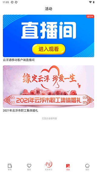 进入“活动”栏,可查看最新本地活动与移动客户端的直播信息,了解参与动态。