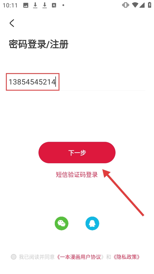 在密码登录或注册页面,输入手机号码后点击【下一步】按钮。