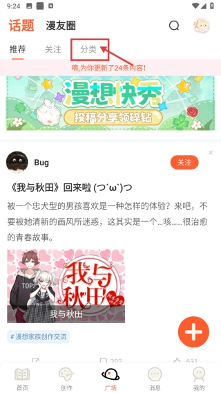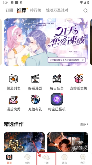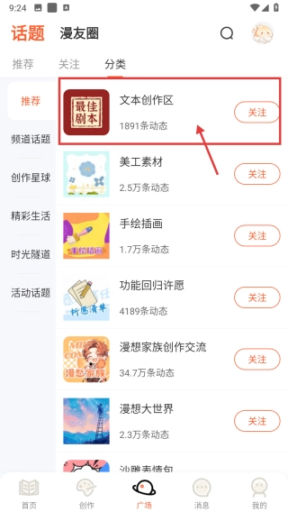进入漫画创作分类,点击底部的广场选项,即可进入广场页面。