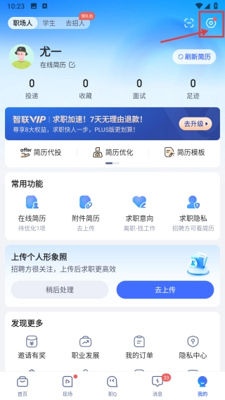 打开求职类应用,点击底部导航栏的“我的”选项,即可进入个人中心页面。