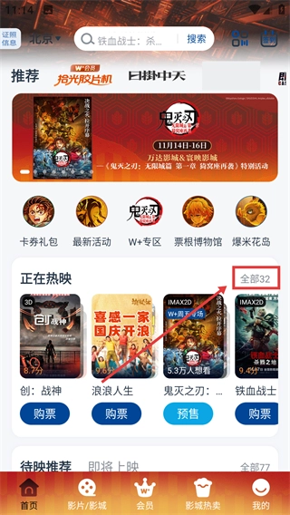 在影讯页面找到【正在热映】板块,点击其右侧的【全部32】选项,即可浏览所有当前热映的影片。