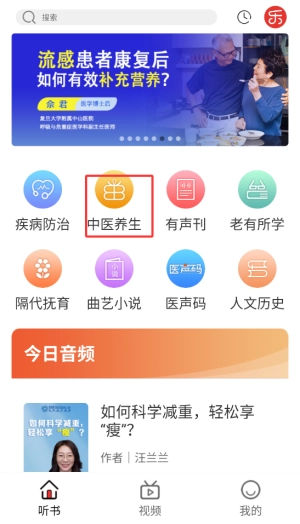 1. 打开乐龄听书APP,于首页的分类栏目里挑选“中医养生”频道,该频道集合了健康养生类的音频内容。