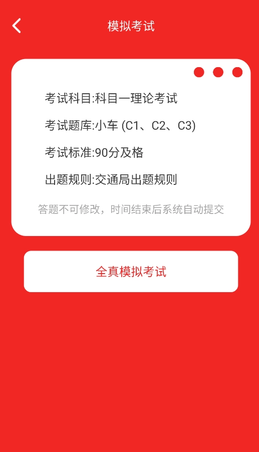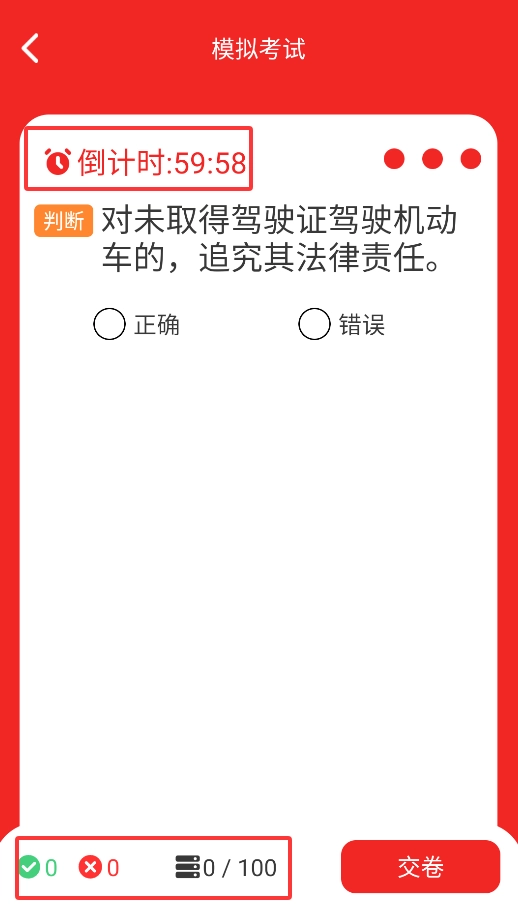 2. 仿真考试严格依据交管部门的命题规则进行组卷,会实时呈现倒计时以及答题正确率。