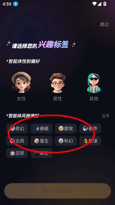 2. 挑选兴趣标签后进入主页