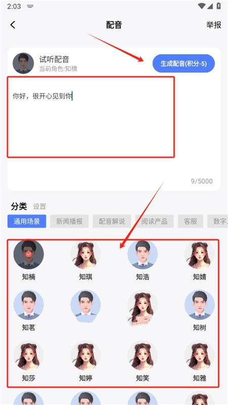 4、轻点AI配音,录入配音内容,挑选心仪的配音角色,再点击生成配音就完成啦。