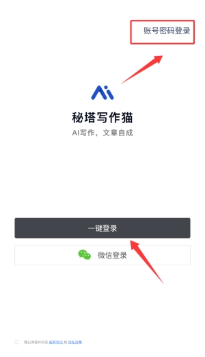 1、打开秘塔写作猫APP,在登录界面能够选择微信快捷登录、传统账号密码登录这两种方式。