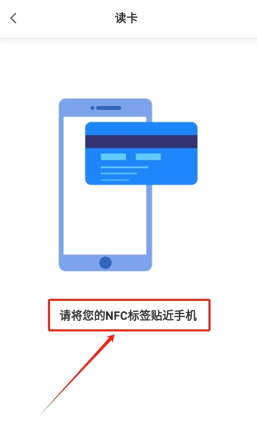 3、点击之后,依照提示,将手中的NFC标签靠近手机背面的感应区域,等待软件读取卡片信息即可。